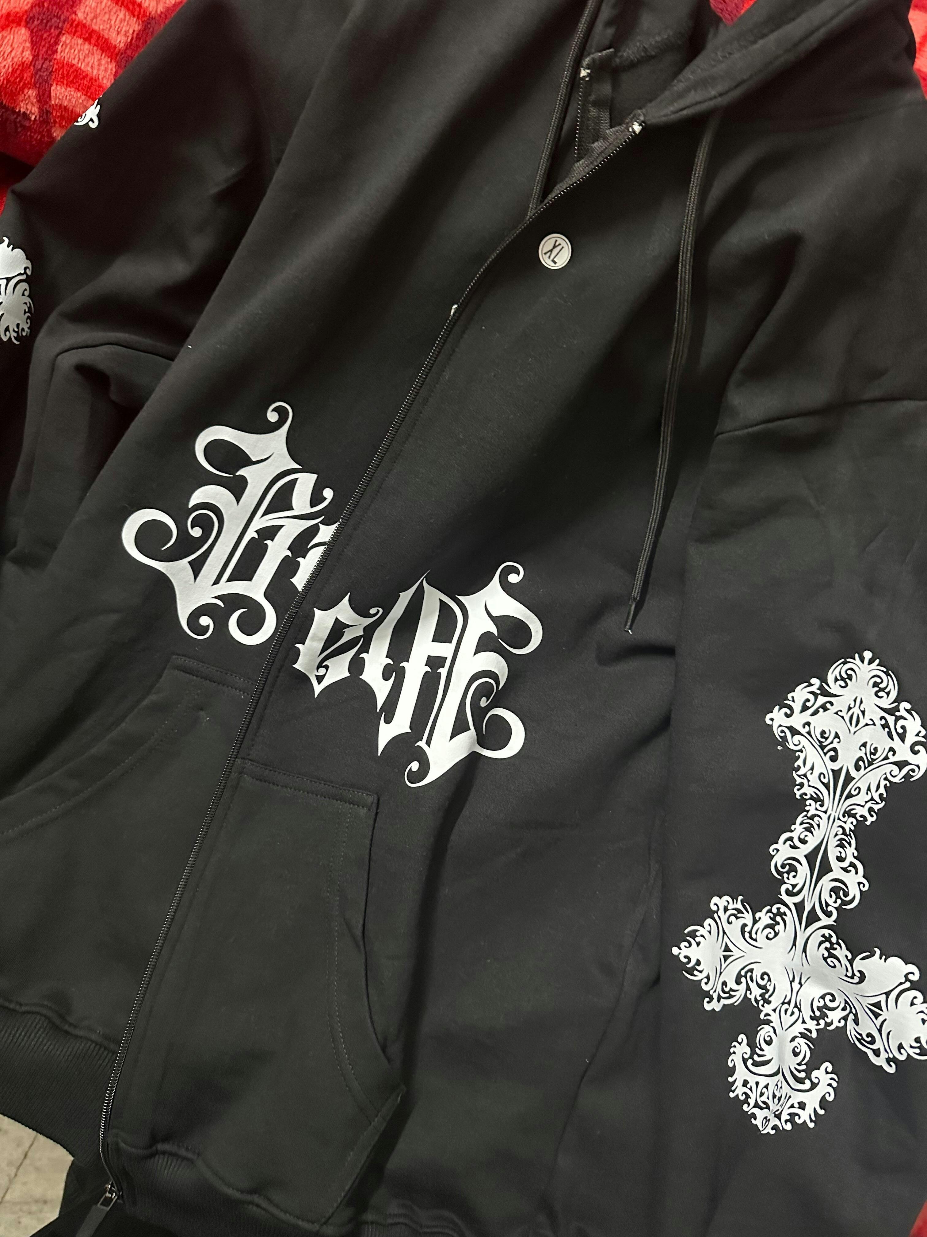 The Bloodline Zip Hoodie blends gothic calligraphy with a sharp, modern silhouette. The bold front script anchors the piece, while intricate sleeve graphics add depth and detail—creating a balanced design that feels heavy in presence, yet clean enough for everyday wear.