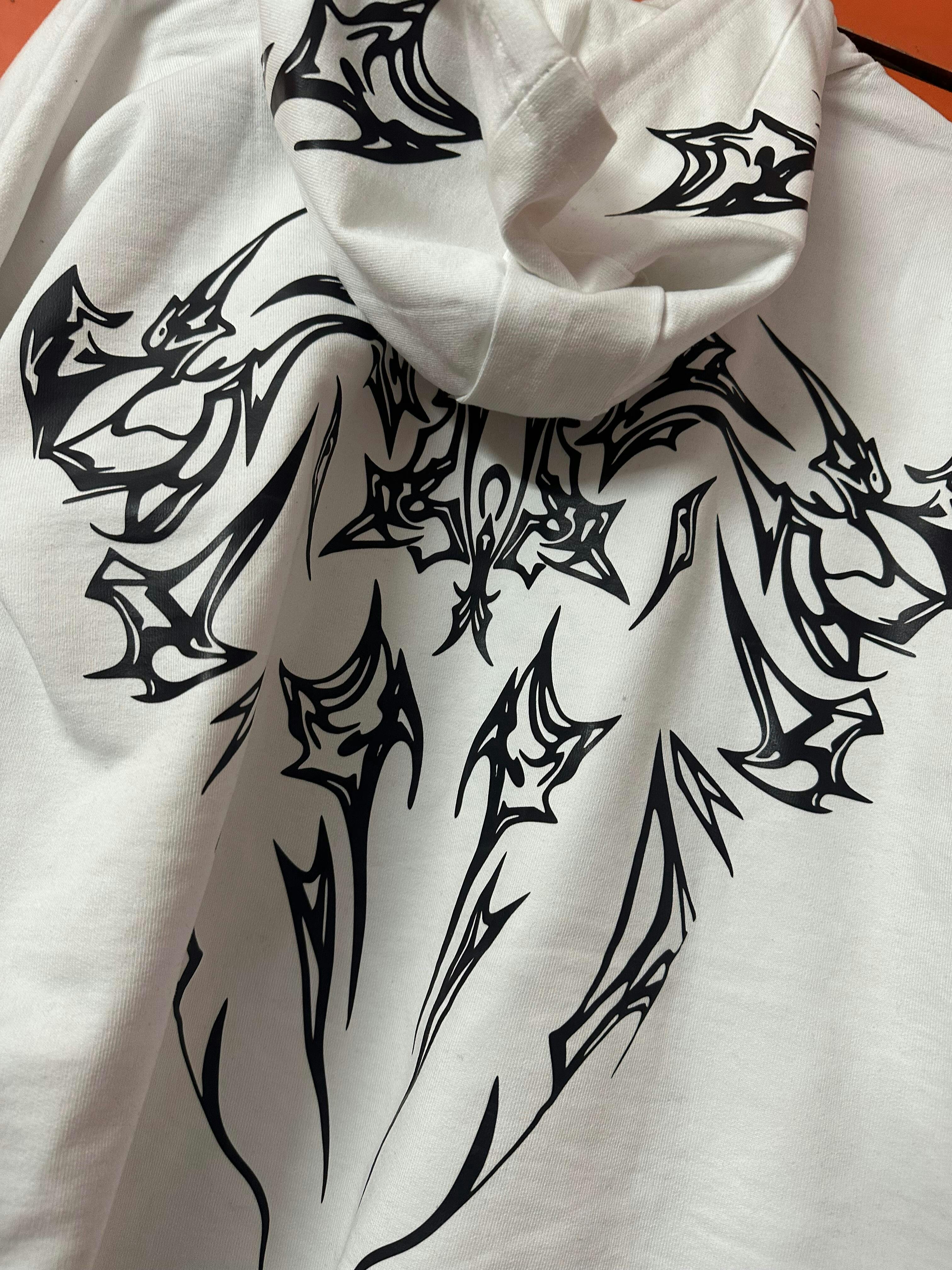 The White Fang Hoodie is built as a statement piece. A bold, razor-sharp fang sigil spreads across the back, inspired by gothic wings and underground iconography. Set on a clean white base, the contrast hits instantly—powerful, sharp, and impossible to ignore.